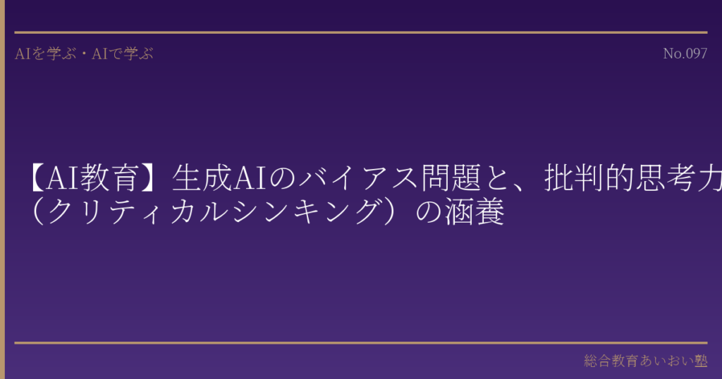 お子さまが生成AIを学習に活用する場面が増えるなかで、AIの出力に含まれるバイアスに気づき、それを批判的に検証する力――すなわちクリティカルシンキング(批判的思考力)――を育てることは、現代の教育において欠かせないテーマとなっています。本記事では、生成AIのバイアス問題の実態を整理し、ご家庭で取り組める批判的思考力の育成方法を考察いたします。