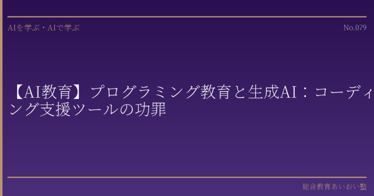 総合教育あいおい塾|AI教育シリーズ 1. 導入:「AIがコードを書く時代」にプログラミングを学ぶ意味 GitHub Copilot、ChatGPT、Claude、Amazon CodeWhispererをはじめとするAIコーディング支援ツールの登場は、ソフトウェア開発の現場に大きな変化をもたらしています。自然言語で指示を出すだけで、AIが実用的なプログラムコードを生成してくれる時代が、すでに到来しています。 この状況を受けて、「AIがコードを書いてくれるなら、人間がプログラミングを学ぶ必要はなくなるのではないか」という問いが、教育の場でも頻繁に聞かれるようになりました。2020年度から小学校で必修化されたプログラミング教育の意義は、根本から問い直されるべきなのでしょうか。 本記事では、AIコーディング支援ツールの現状と限界を正確に把握したうえで、それがプログラミング教育にもたらす「功」と「罪」の両面を考察いたします。そして、「AIに書かせる」のではなく「AIと一緒に考える」プログラミング教育のあり方を提案いたします。 2. 基礎解説:AIコーディング支援ツールの仕組みと現状 2-1. AIコーディング支援ツールの基本原理 GitHub Copilotに代表されるAIコーディング支援ツールは、大規模言語モデル(LLM)を基盤としています。膨大なソースコードとその説明文を学習データとして訓練されたモデルが、プログラマーの入力(コメント、関数名、部分的なコードなど)を手がかりに、「次に書かれるべきコード」を予測・生成します。 その精度は年々向上しており、定型的な処理やよく使われるアルゴリズムの実装においては、熟練のプログラマーに匹敵するコードを生成できるレベルに達しています。 2-2. AIが「できること」と「できないこと」 AIコーディング支援が得意な領域: 定型的なコードパターンの生成(データベース操作、ファイル入出力など) ライブラリやフレームワークの使用方法に沿ったコード補完 既存コードのリファクタリング(読みやすさの改善) テストコードの自動生成 エラーメッセージの解釈と修正案の提示 AIコーディング支援が苦手な領域: 要件の本質的な理解(「何を作るべきか」の判断) システム全体の設計思想の構築 ビジネスロジックの妥当性の検証 セキュリティ上の脆弱性の包括的な検出 生成したコードの正確性の保証 2-3. プログラミング教育の現在地 日本においては、2020年度に小学校でプログラミング教育が必修化され、2021年度には中学校の技術・家庭科でプログラミングの内容が拡充、2022年度には高等学校で「情報I」が必履修科目となりました。2025年度の大学入学共通テストからは「情報」が出題教科に加わっています。 このように、プログラミング教育は制度的に定着しつつありますが、その内容とAIコーディング支援ツールの関係については、まだ十分な議論が行われていないのが現状です。 3. 深掘り研究:AIコーディング支援ツールの「功」と「罪」 3-1. 「功」の側面 学習のハードルを下げる プログラミング学習における最大の障壁の一つは、文法エラーやタイプミスによる挫折です。初学者がプログラミングを断念する原因の多くは、論理的な理解の不足ではなく、些末な構文エラーへの対処に疲弊することにあります。 AIコーディング支援ツールは、構文の補完やエラーの自動修正によって、この障壁を大幅に引き下げる可能性があります。学習者は低レベルの構文規則に煩わされることなく、「何をどのような手順で実現するか」というより本質的な思考に集中できるようになります。 学習のフィードバックループを加速する 従来のプログラミング学習では、「コードを書く→エラーが出る→原因を調べる→修正する」というサイクルに多くの時間を要していました。AIコーディング支援ツールは、このサイクルを大幅に短縮し、学習者がより多くの試行錯誤を短時間で経験できるようにします。 教育心理学の知見が示すように、学習効率はフィードバックの速度と質に大きく依存します。AIツールが即座に代替案やエラーの説明を提示してくれることは、学習のフィードバックループを改善する効果を持ちます。 「読むプログラミング」の促進 AIが生成したコードを読み、理解し、評価する活動は、「書くプログラミング」とは異なる教育的価値を持ちます。他者が書いたコードを読解する力――いわゆる「コードリーディング」の能力――は、実際のソフトウェア開発においてきわめて重要なスキルです。 AIが生成したコードを批判的に読み解く訓練は、プログラミングの理解を深める有効な学習方法となりえます。 3-2. 「罪」の側面 「理解なき生成」の危険性 AIコーディング支援ツールの最も深刻なリスクは、学習者が「なぜそのコードが動くのか」を理解しないまま、AIの出力をそのまま利用してしまうことです。これは、数学において計算機を使って答えだけを得る行為に類似しています。 教育学において、この問題は「生成効果」(generation effect)の喪失として説明できます。自分自身で