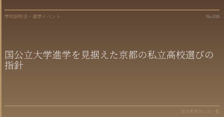 はじめに――「私立高校=私立大学への進学」ではない時代 京都府で高校選びを考える際、「国公立大学を目指すなら公立高校」「私立高校は付属大学や私立大学への進学が中心」という認識をお持ちの保護者の方は少なくないのではないでしょうか。 しかし、近年の京都の私立高校を取り巻く状況は大きく変わっています。特進コースの設置や進学指導体制の強化を通じて、国公立大学への合格実績を着実に伸ばしている私立高校が増えてまいりました。とりわけ京都は、全国有数の私立高校の集積地であり、それぞれの学校が独自の教育理念とカリキュラムを打ち出しています。 本記事では、「国公立大学進学」という観点から京都の私立高校を検討する際に、保護者の方が押さえておくべき判断軸を体系的に整理いたします。個別の学校名を挙げて優劣をつけることは本稿の趣旨ではありません。あくまでも「どのような視点で比較・検討すべきか」という指針を提供することを目的としています。 1. 京都の私立高校における進学コース制度の基本構造 1-1. コース制の分類と名称 京都の私立高校の多くは、複数のコースを設けて生徒の進路目標に応じた教育を提供しています。名称は学校によって異なりますが、おおむね以下のように分類できます。 最難関・特進Sコース系:東大・京大・医学部など最難関国公立大学を目標とするコース 特進コース系:国公立大学・難関私立大学への一般入試合格を目標とするコース 進学コース系:私立大学への進学を中心に、指定校推薦や総合型選抜も視野に入れたコース 総合・標準コース系:多様な進路(大学・短大・専門学校・就職)に対応するコース 国公立大学進学を目指す場合、上位2つのコースが主な選択肢となります。ただし、コースの名称が同じでも、学校によって教育内容や進学実績には大きな差があります。名称だけで判断せず、後述する具体的な判断ポイントを確認することが重要です。 1-2. コース間の移動制度 多くの私立高校では、入学後の成績に応じてコース間の移動(いわゆる「コース変更」「コースアップ」)を認めています。この制度の有無と運用実態は、志望校選びの重要な判断材料です。 移動の時期(1年次末、2年次末など) 移動の条件(成績基準、面談の有無) 実際の移動実績(制度としてはあるが、実際にはほとんど移動がないケースもあります) 入学時に特進コースに届かなかった場合でも、進学コースから努力を重ねて特進コースへ移動できる可能性があるかどうかは、保護者として確認しておきたい点です。 2. 国公立大学進学力を見極めるための判断ポイント 2-1. 合格実績の正確な読み方 進学実績は、学校選びにおいて最も参照されるデータの一つですが、数字の読み方には注意が必要です。以下の点を意識してください。 (1)「延べ合格者数」と「実合格者数」の区別 一人の生徒が複数の大学に合格した場合、延べ合格者数はその分だけ加算されます。「国公立大学○○名合格」という表記が延べ人数なのか実人数なのかによって、実態は大きく異なります。学校説明会などの場で、実人数での実績を確認されることをおすすめします。 (2)コース別の合格実績の確認 学校全体の合格実績だけでなく、お子さまが入学を検討しているコースの実績を確認することが不可欠です。特進コースの実績が優れていても、その人数が学年全体のごく一部であれば、進学コースの生徒にとっての参考値にはなりません。 (3)卒業生数に対する比率 合格者の絶対数だけでなく、卒業生数に対する国公立大学合格者の割合を算出すると、より正確な比較が可能です。卒業生200名で国公立大学合格者20名の学校と、卒業生400名で同じく20名の学校では、進学指導の密度が異なります。 2-2. カリキュラム編成の確認ポイント 国公立大学入試は、大学入学共通テスト(旧センター試験)で幅広い教科・科目が課されます。したがって、高校のカリキュラム編成は合否に直結する重要な要素です。 (1)文理選択の時期 文系・理系の選択時期は学校によって異なります。一般的には2年次からの分離が多いですが、一部の学校では1年次の後半から分かれるケースもあります。 選択が早い場合のメリット:専門科目の学習時間を多く確保できる 選択が早い場合のリスク:進路の方向性が定まらないまま選択を迫られる可能性がある お子さまの進路意識の成熟度と照らし合わせて、適切な時期に選択できる環境かどうかを見極めてください。 (2)理数系科目の単位数と進度 国公立大学の理系学部を志望する場合、数学III・物理・化学などの理数系科目の履修単位数と授業進度は極めて重要です。確認すべき点は以下の通りです。 数学IIIの履修開始時期と完了時期 理科の選択科目数(物理・化学・生物のうち2科目を十分に学習できるか) 共通テスト対策と個別試験(二次試験)対策の時間配分 理数系の学習進度が遅い場合、3年次に共通テスト対策と二次試験対策を並行して進めなければならず、生徒の負担