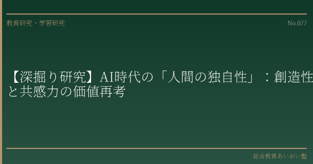 AI時代における教育の最も重要な課題は、「AIに負けない人間を育てる」ことではなく、「人間であることの固有の価値を理解し、発揮できる人間を育てる」ことだと考えます。