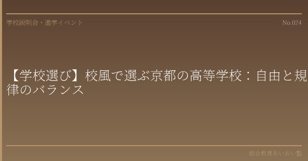 京都の高等学校には、自由で開放的な学校もあれば、規律正しく体系的な学校もあり、宗教的な精神性を基盤とする学校もあります。いずれの校風にも固有の教育的価値があり、優劣をつけるべきものではありません。