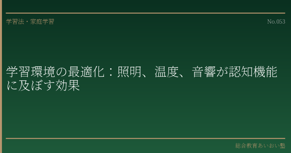 本稿では、環境心理学の知見に基づき、照明・温度・音響の三つの物理的条件が学習パフォーマンスに与える影響を整理したうえで、ご家庭の学習スペースを最適化するための具体的な指針をご提案いたします。